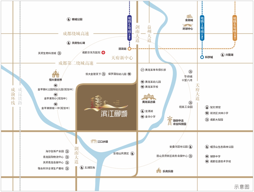 占据剑南大道南延线位置,双机场通道黄金交汇点,黄龙溪港特色水上旅游通路等。社区巴士直达地铁五号线与彭山北站,规划中S13轻轨贯穿其中,预计年底通车的环天府新区快速通道,黄龙溪客运站,出行便捷无忧。