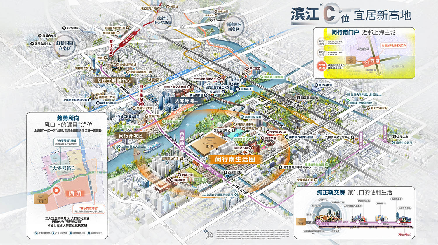 紧靠地铁5号线地铁口,一站接轨闵行,直达莘庄,西渡板块正式进入发展快车道,且5号线沿线商业已然非常繁盛,超一半站点都有商业体,而且势能还在继续攀升,高能级商业赋能,区域发展未来可期。