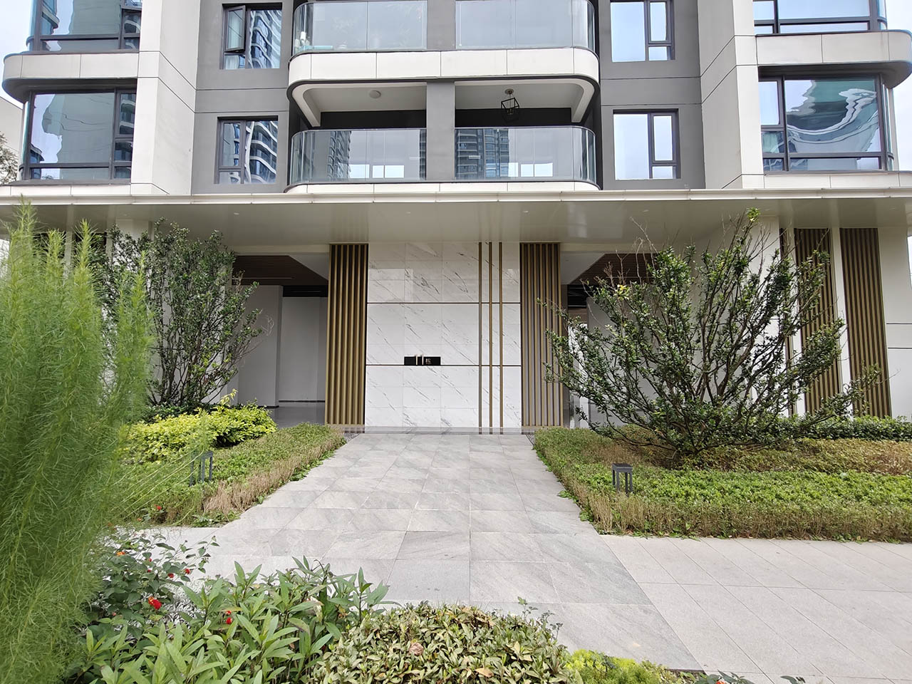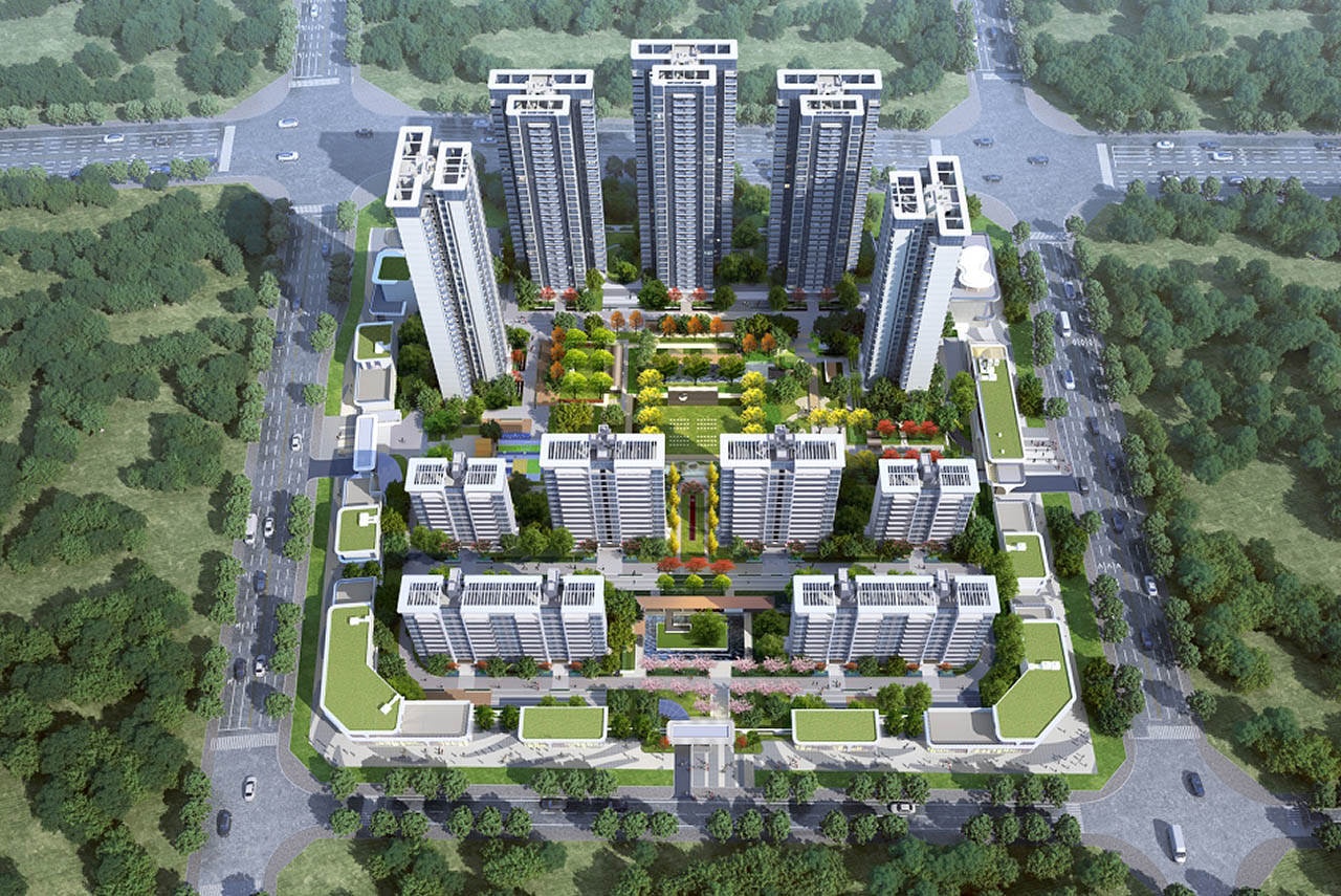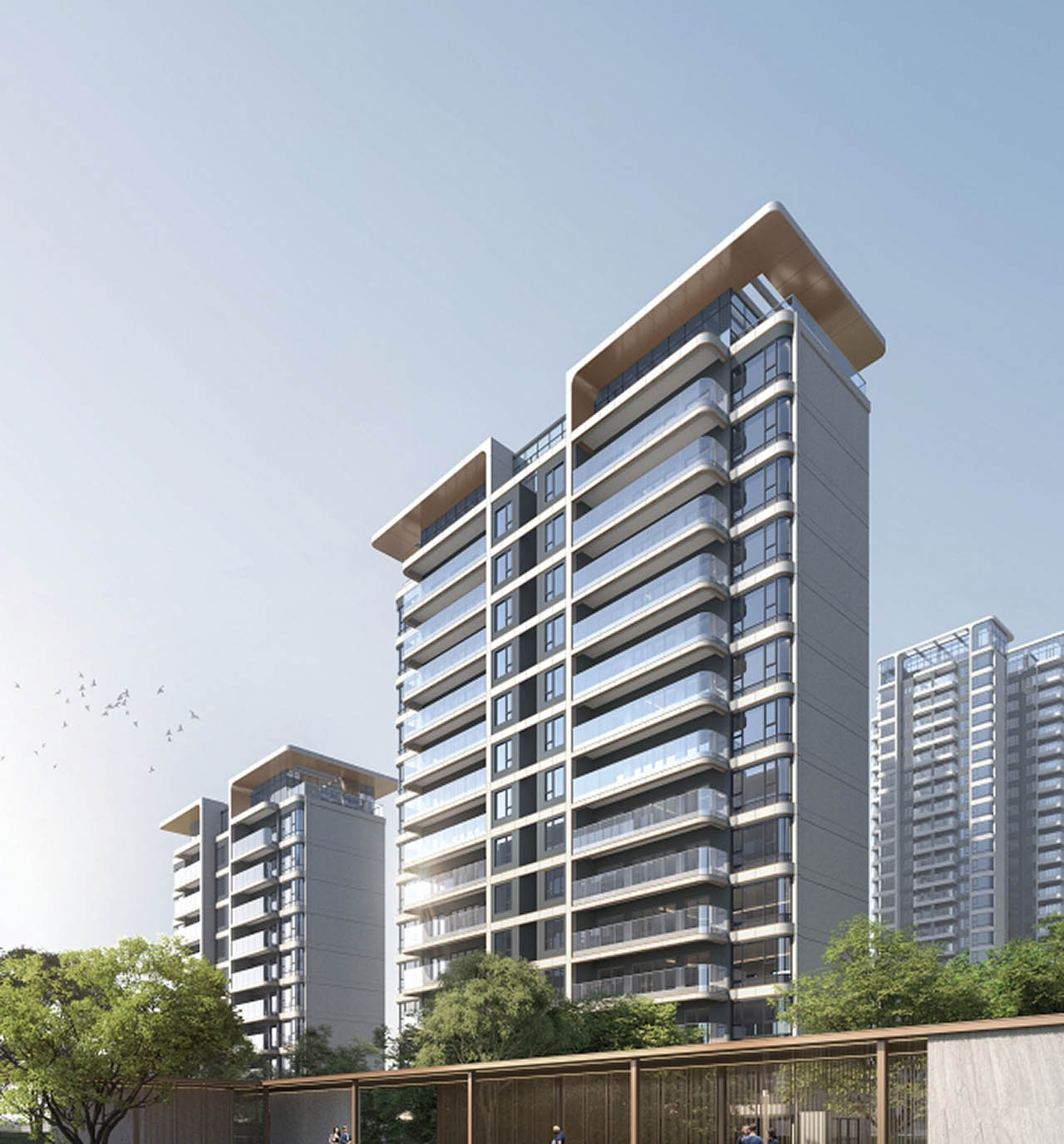 建筑立面采用简洁的现代风格、线条明快、布局对称,营造出时尚、精致、大气的视觉感受。形态丰富的平屋顶设计、考究的造型与协调的色彩,赋予本案生动丰富的城市形态和尊贵的品质感,增添城市气息。