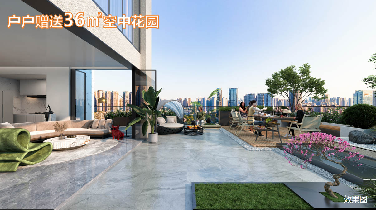 户户送约40㎡空中花园,院里有花草,一家人闲暇之余可与自然近距离接触,感受初升的朝霞、傍晚的宁静;还可约上亲朋好友,在此举办一场茶话会,谈天说地,让您在家中也能拥有私密的户外空间。