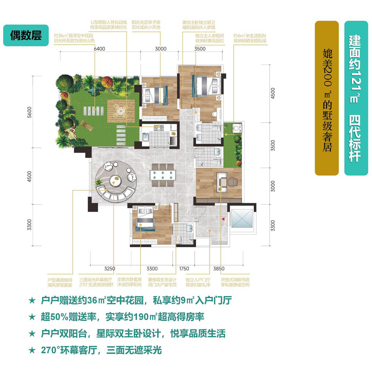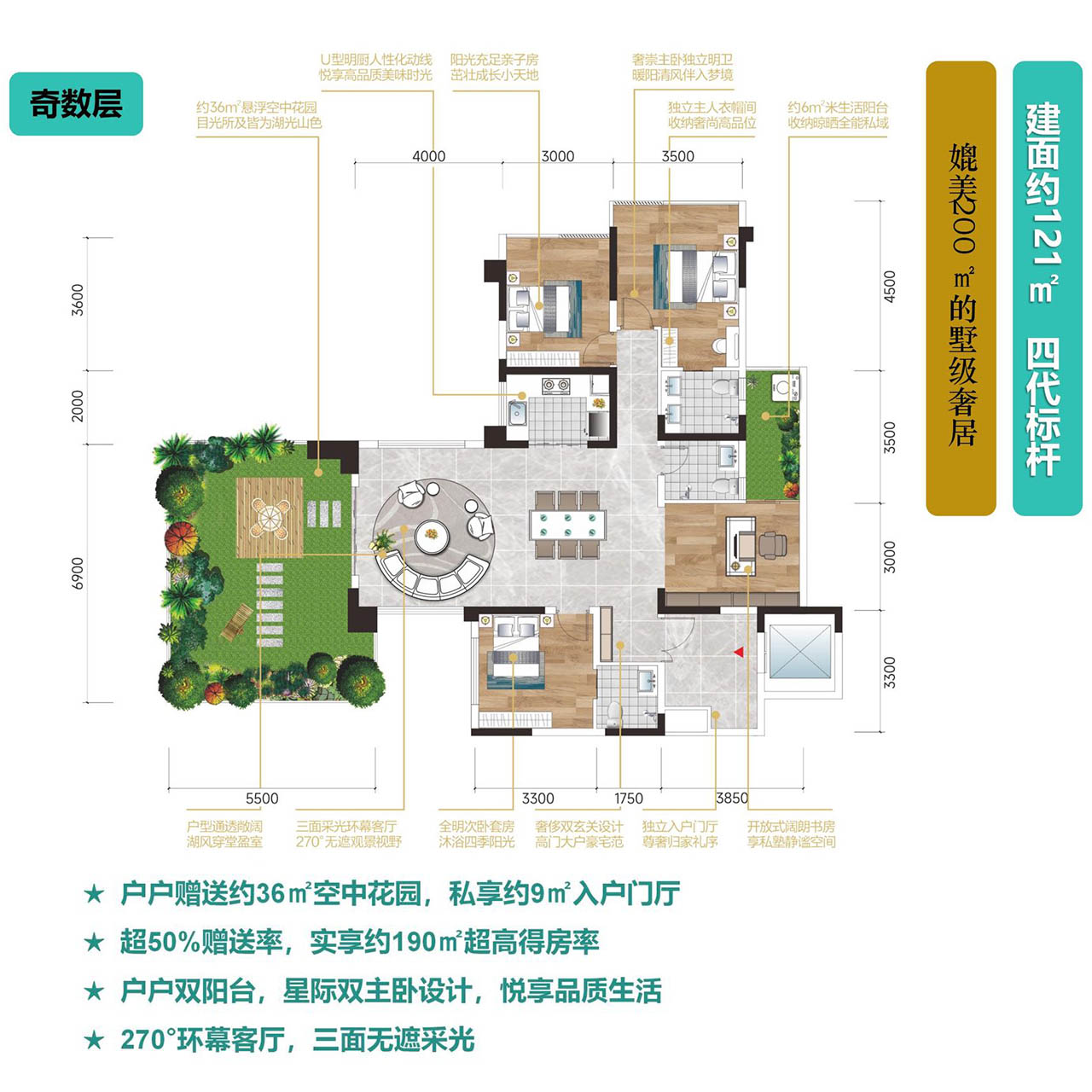 约50%的赠送率,实现约120%实得率,建面约121㎡的空中花园产品,实际使用面积高达190㎡,私享约9㎡的入户门厅、双阳台星级双主卧,仪式感自然而然的降临您家,您将获得超出预期的价值回报。