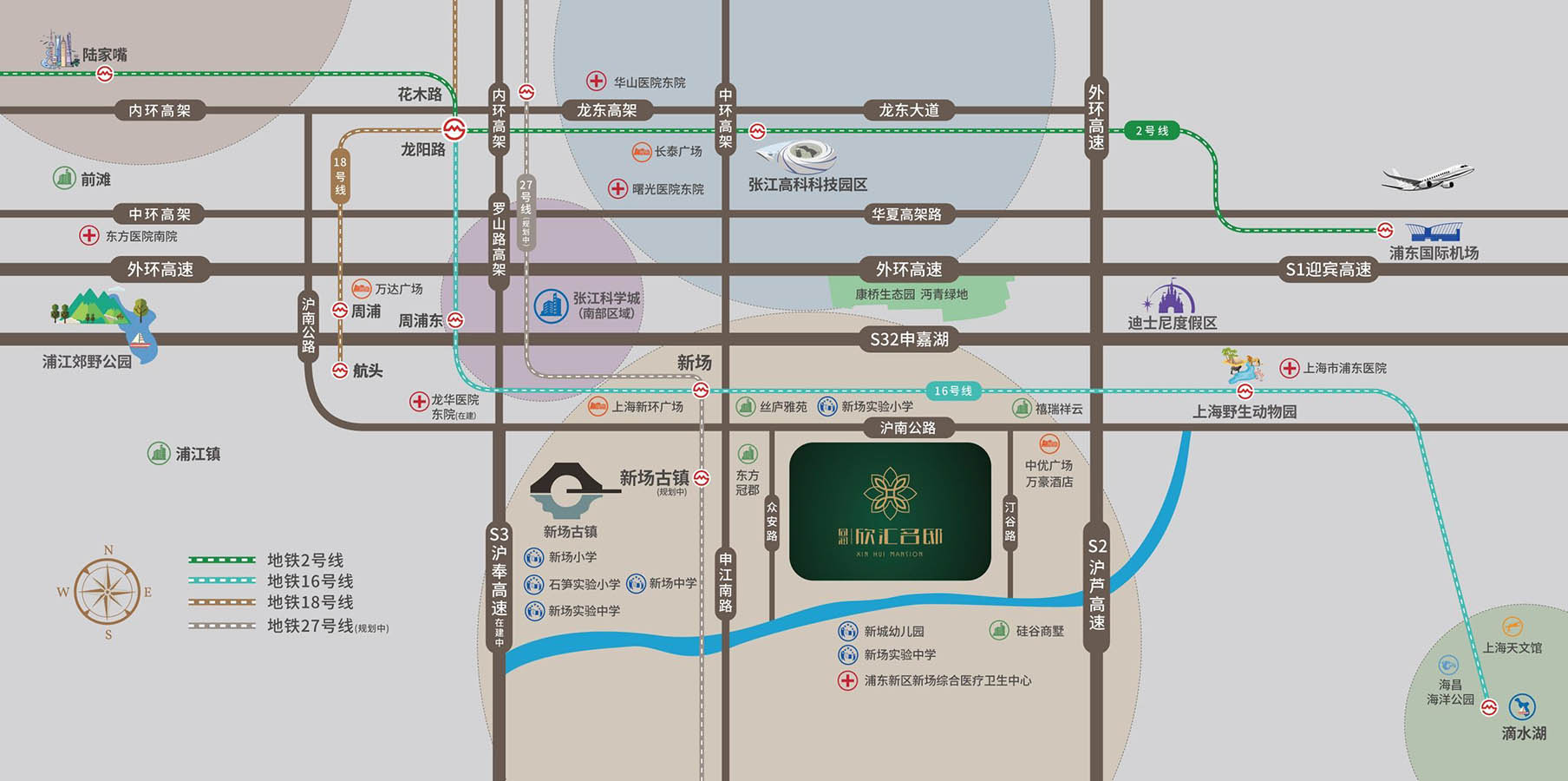 拥有新场古镇、迪士尼乐园、上海野生动物园、冰雪世界、海昌海洋公园等,共同围合成臻稀的生态宜居地。新场古镇作为上海的古镇代表,正在和周庄、乌镇、西塘等长三角十座古镇,联手申报世界文化遗产。