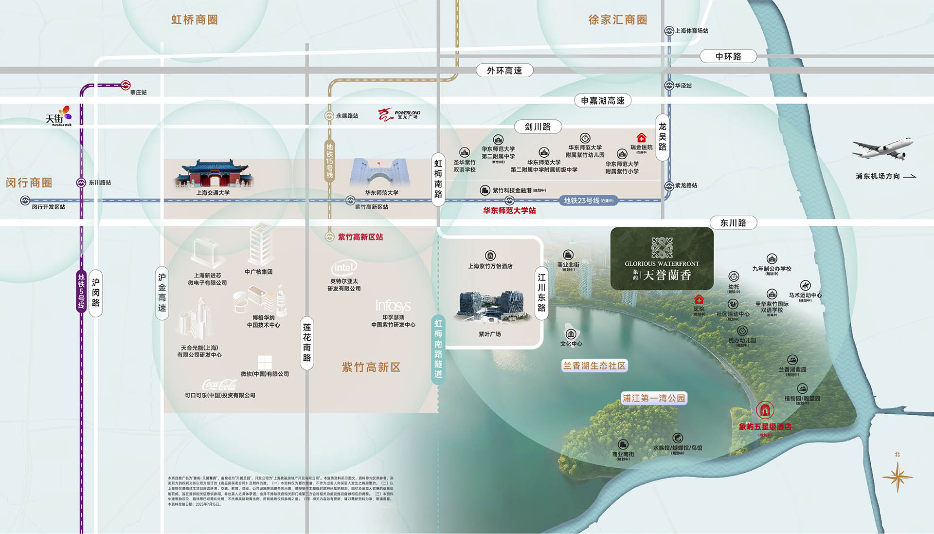 兰香湖周边的教育、科研配套很强势。不仅有紫竹高新区、华师大/交大本部,更有全套的华师大紫竹基础教育体系,完整贯穿幼儿园至高中。高知、高薪的社区氛围,也让紫竹成为了主城区里“独一份”,呈现出多元化的配套和高水准的城市风貌。