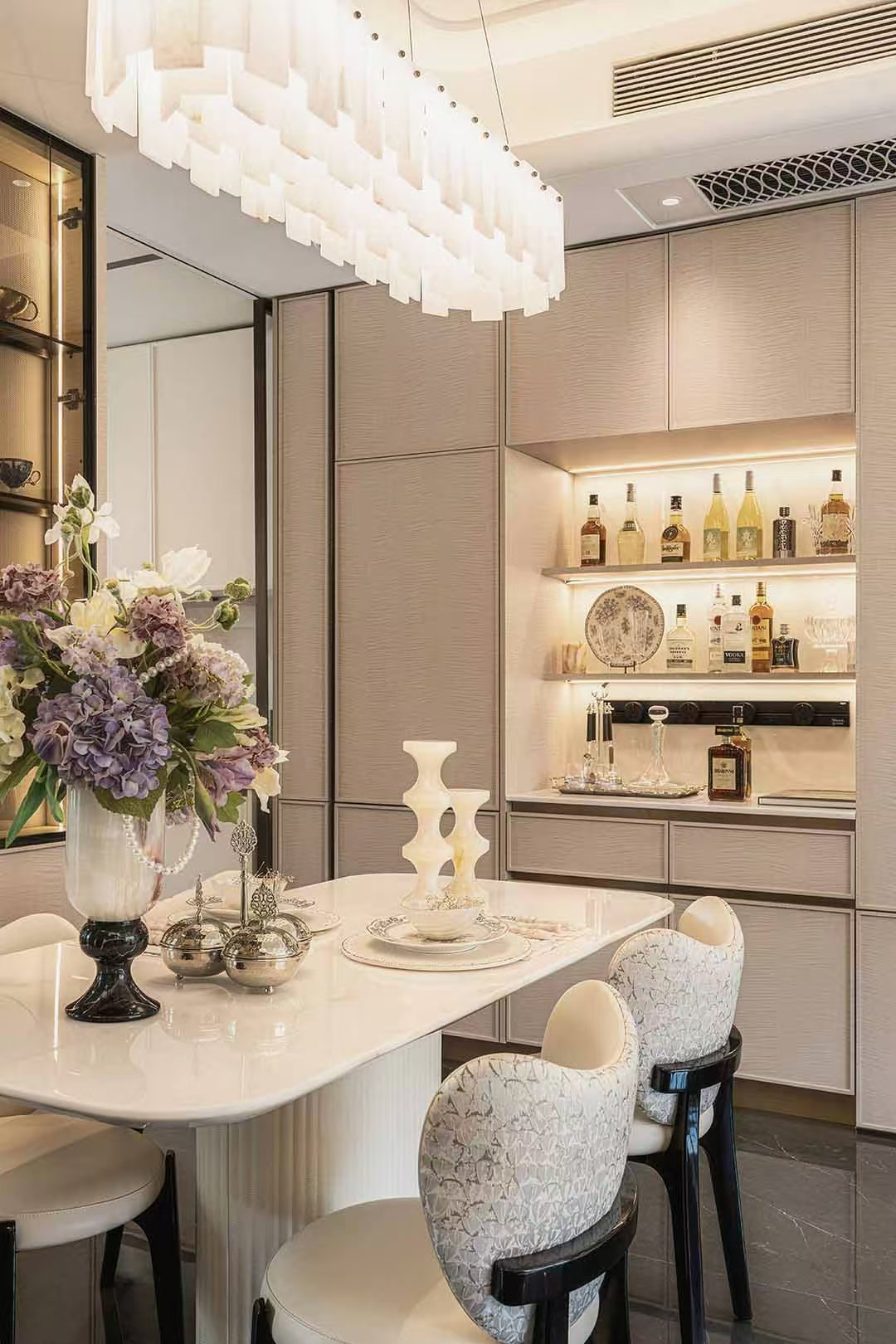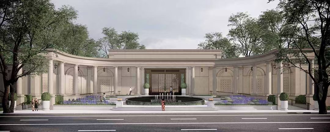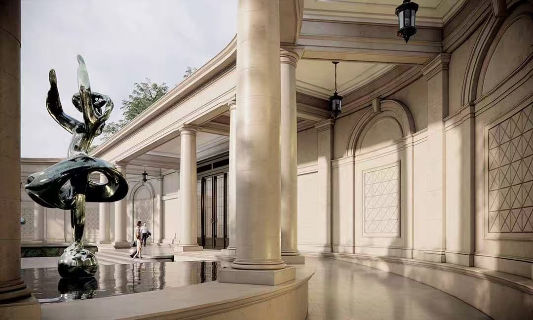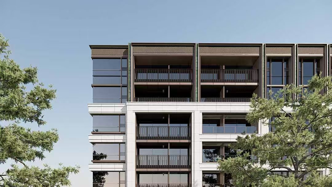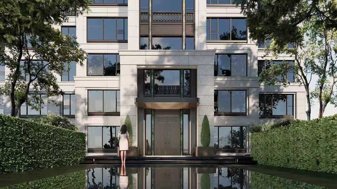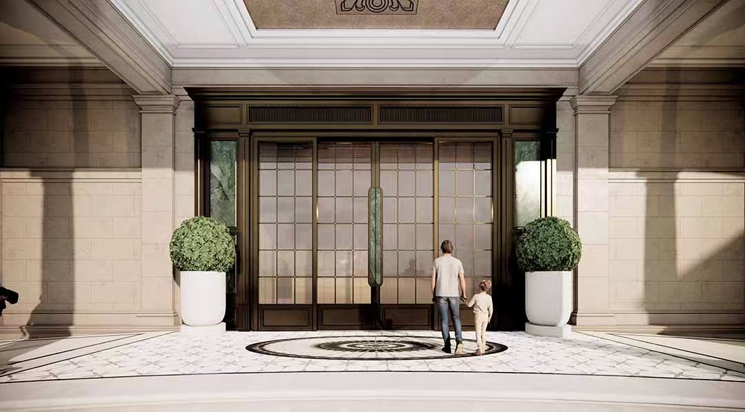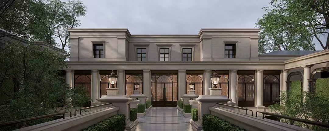 汲取伦敦老牌豪宅区切尔西公寓建筑立面灵感,传承并以现代建筑语言转译18世纪的乔治亚风格建筑,呈现严谨的对称与精致的细节,赋予建筑秩序之美;“三段式”黄金分割比例,与源自巴黎旺多姆广场灵感的线条肌理,构筑城市封面级的建筑标杆。