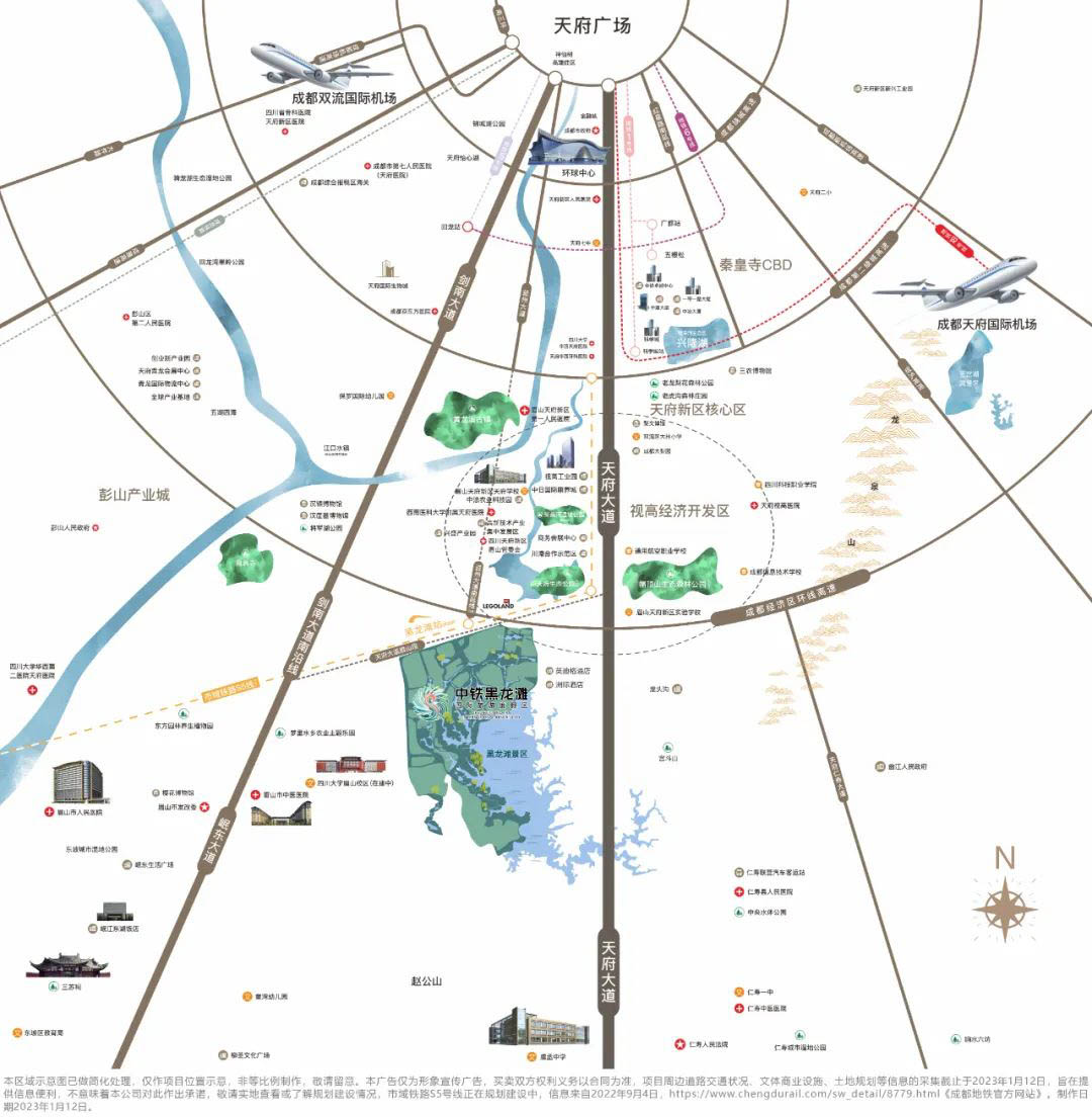 成都紧沿天府大道,以昂首阔步之姿一路向南,约1578平方公里天府新区横空出世,天府新区未来增长轴,国家级新区——天府新区、国家4A级景区黑龙滩风景区、国家历史文化名城眉山,成都、眉山、仁寿三地交汇地脉,无缝对接,“成都核心城区一小时生活圈”“天府新区半小时生活圈”。
