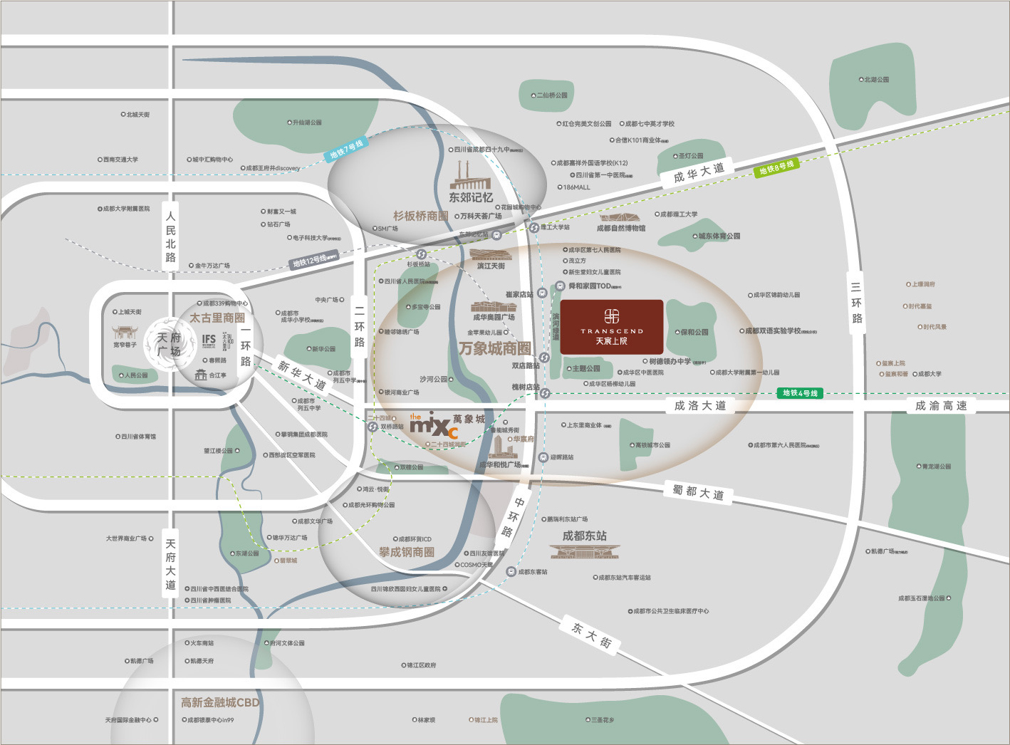 3公里范围内,被万象城、杉板桥、攀成钢三大高能级商圈环绕,创造无可复制的城市底盘,为生活赋予丰富配套:教育资源(树德中学、双语实验学校)、交通资源、生态资源、医疗资源等极致资源,鼎立一个奢宅新圈层。