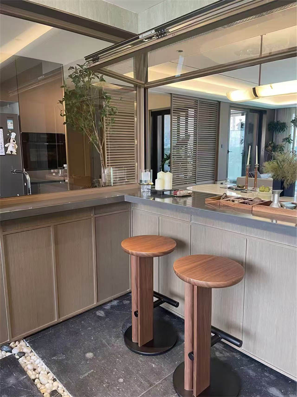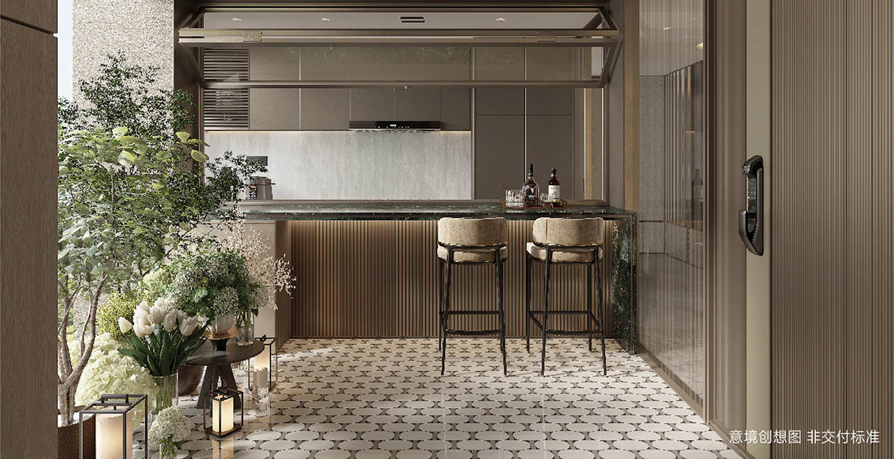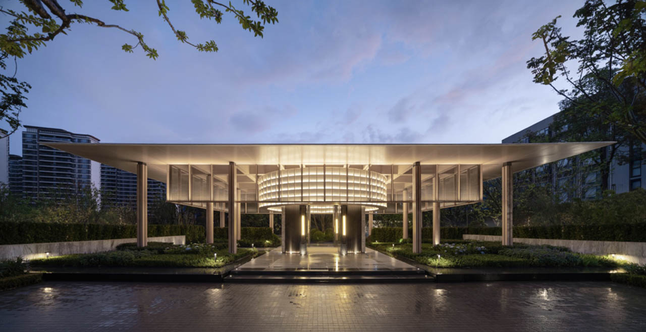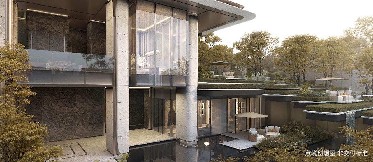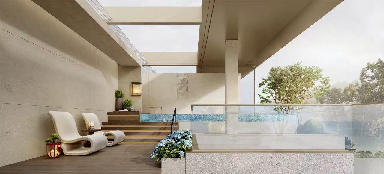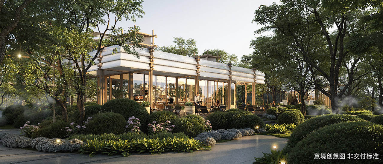 创造性的对市政公园进行深度改造,将城市公园改造为“社区外归家系统”,营造归屿前厅、峡谷花园、归屿内庭三大花园景观,为业主营造从繁城归来的多元转场,由此步入隐于繁华的避世之境,车马院花园,门头构筑充满了标识感,场域气质扑面而来。
