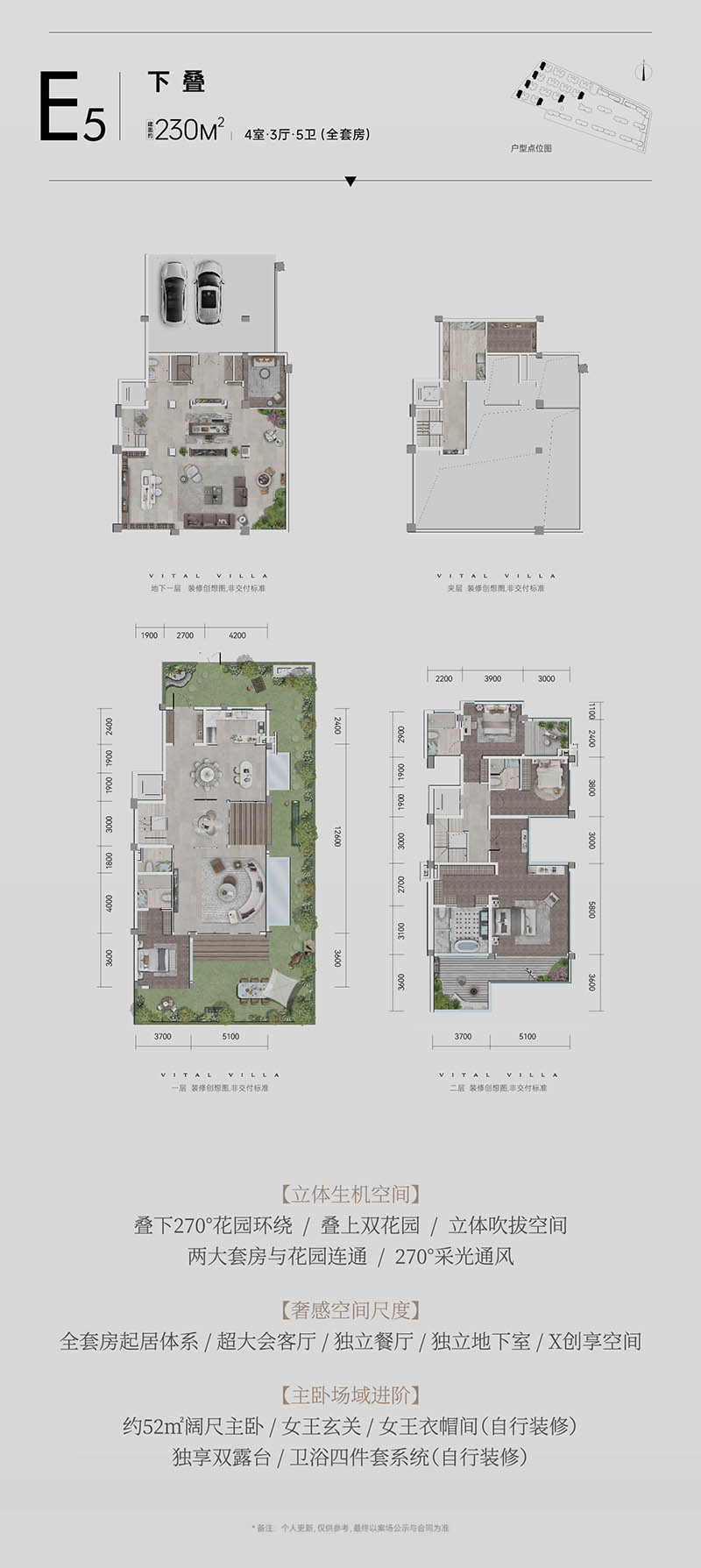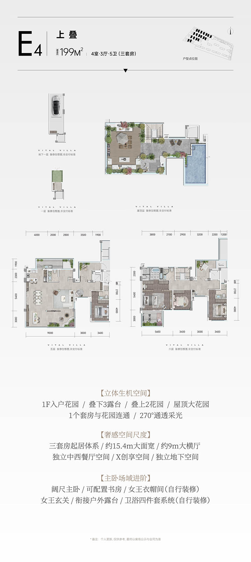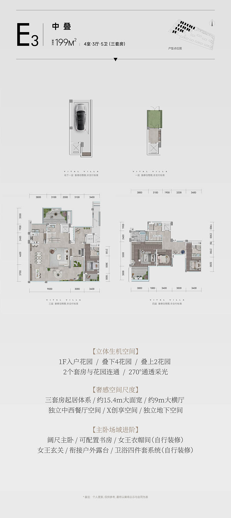 在空间上,颠覆了传统别墅单层空间局限的限制。通过拓宽单层使用面积,延伸露台的生机空间,扩大会客厅的开间尺度,每户均配备专属的1楼入户花园、独立地下室,独享多个宽敞的生态空间,赋予了别墅更为宽敞的大平层体验。