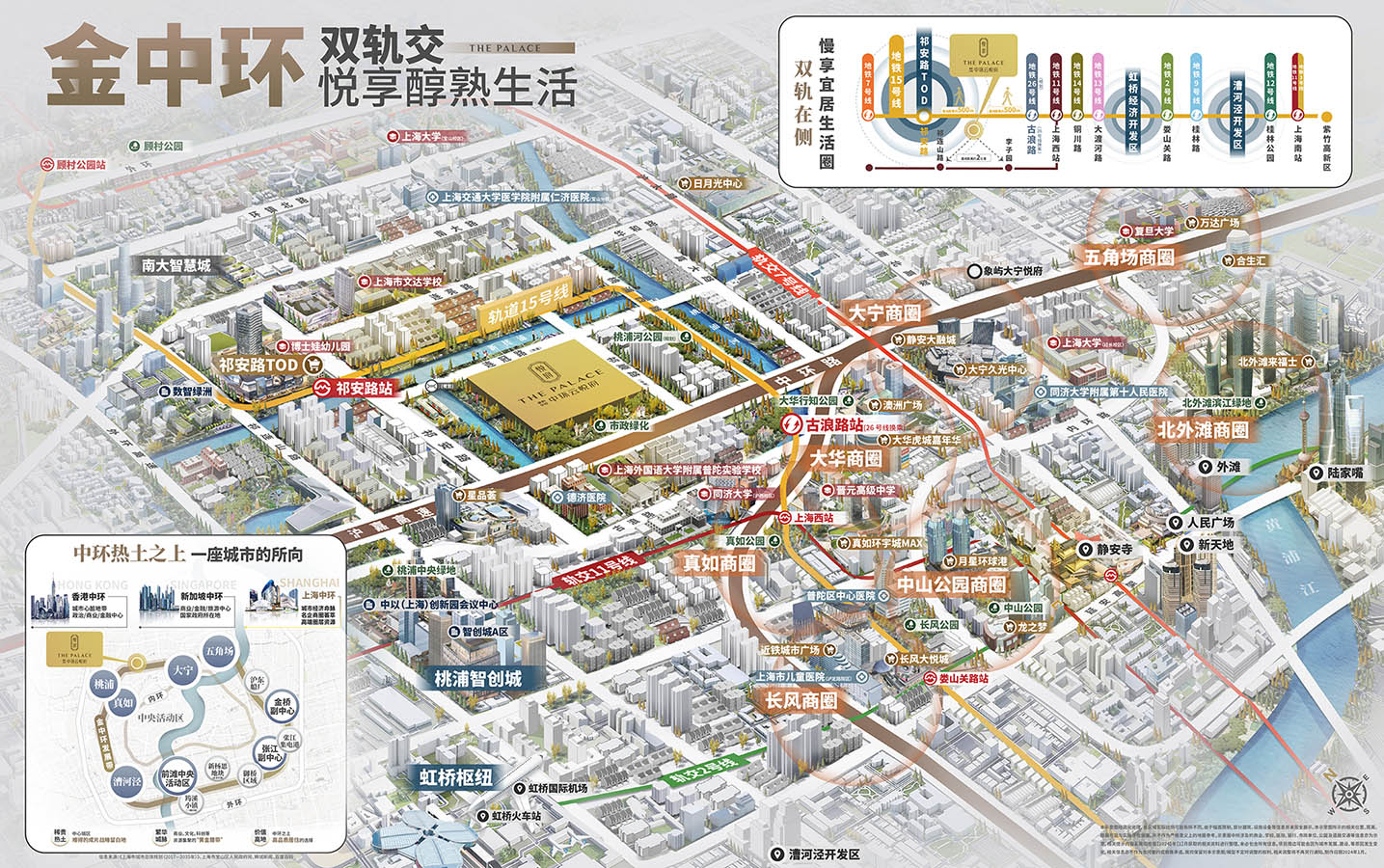 择址中环桃浦心,三块产业板块环绕的中心地带。烫金生活圈之外,产业红利澎湃而来,无论上海如何发展,中环价值始终屹立潮前,中环将城市的商务、金融、贸易、文化娱乐、购物休闲、生活工作集萃一身,是上海城市价值的至高所在。