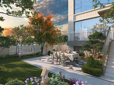 每一套不仅可以独立花园入户,同时实现了入户花园、侧花园、后花园“三园串联”;同时,三园与采光双首层连接,房子被花园多维包围;别墅屋顶还配配置有前后星空花园,整个户型拥有五重花园。